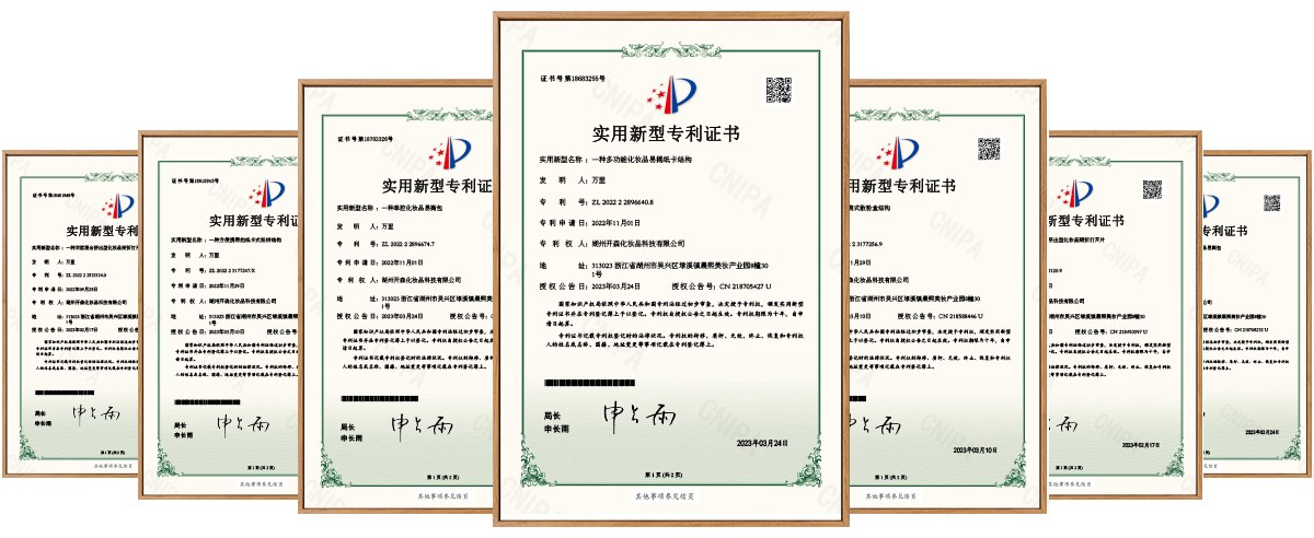 經過多年的研發(fā)創(chuàng)新,湖州開森現擁有【一種便攜式散粉盒結構】、【一種多功能化妝品易揭紙卡結構】、【一種方便攜帶的紙卡式粉餅結構】、【一種雙腔混合擠出型化妝品易撕包】、【一種雙腔掰折擠出型化妝品掰折打開片】、【一種單腔掰折擠出型化妝品掰折打開片證書】等多種專利,可以根據客戶的不同需求,進行深度創(chuàng)新,滿足市場和產品日益更新的需求。